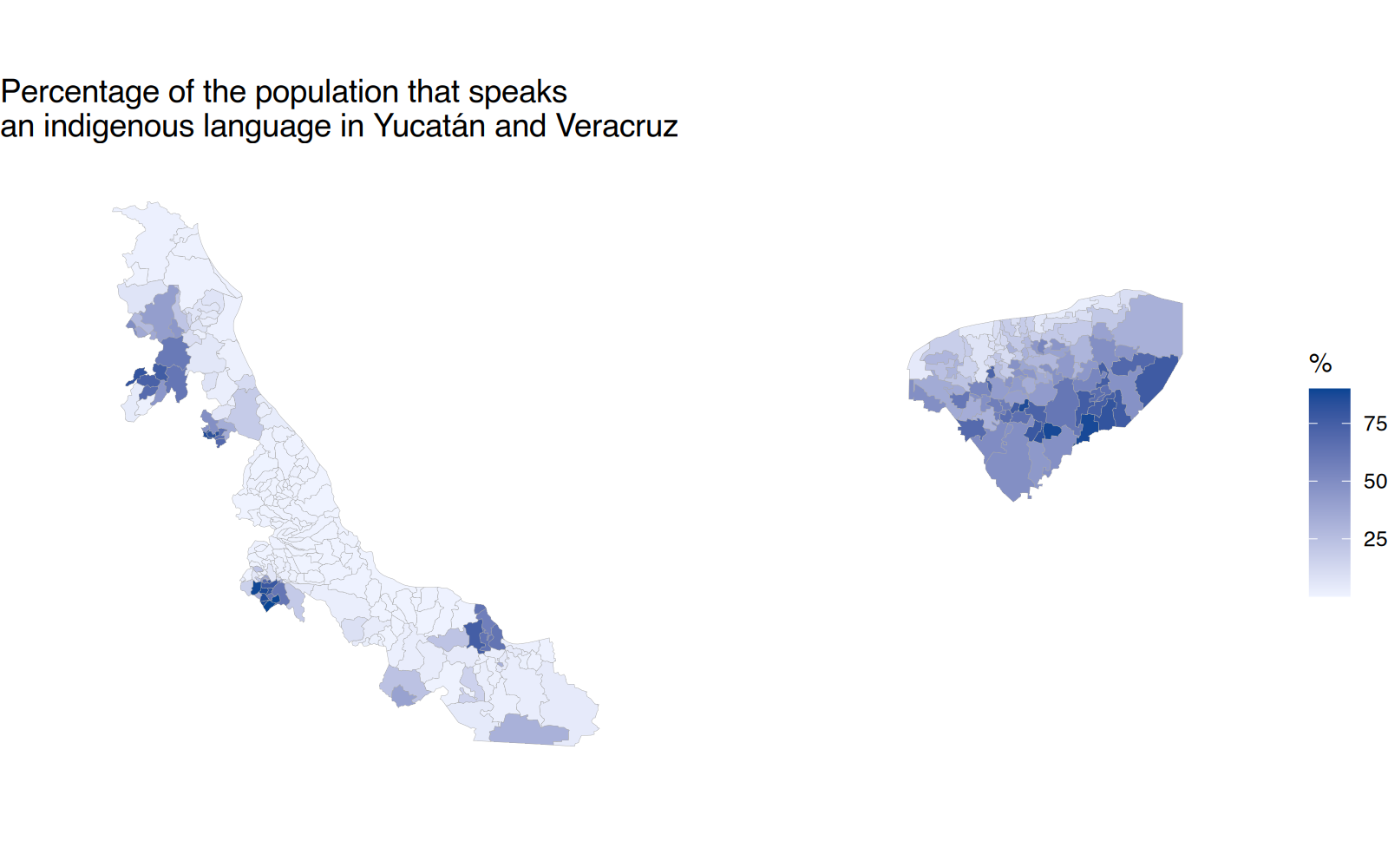 title = "Percentage of the population that speaks\nan indigenous language in Yucatán and Veracruz",